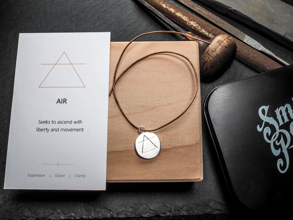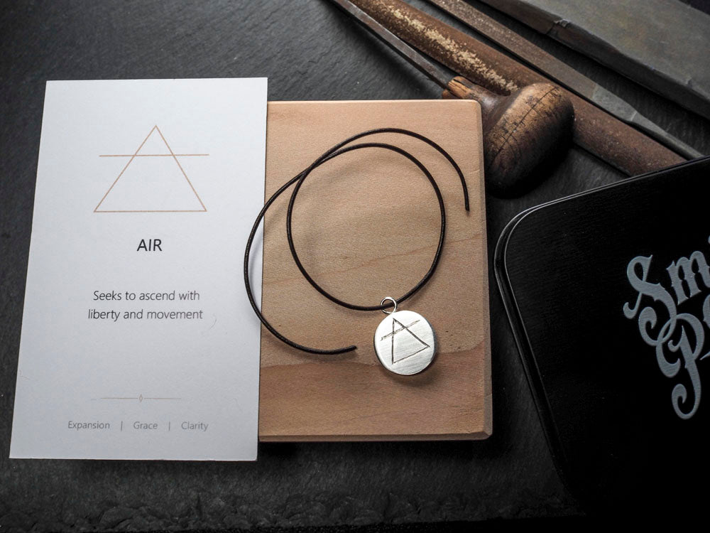 Carry with you the creative energy of expansion, grace and clarity. This pendant is handmade from sterling silver with the alchemy symbol for Air and the strength of the triangle. A gift for your life's journey.